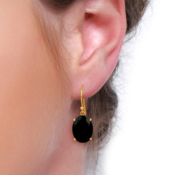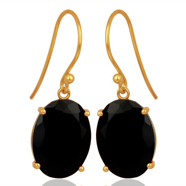 Caravanas colgantes de plata esterlina 925, enchapadas en oro amarillo 14kt. con ónix negro y cierre de gancho. Largo aprox.: 32mm. Ancho aprox.: 12mm. Hechas a mano.