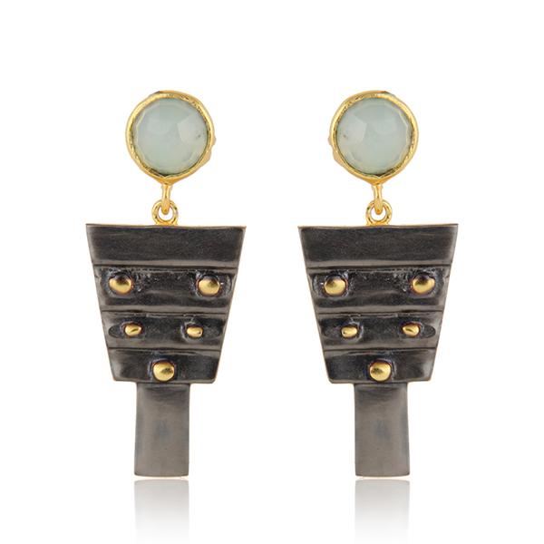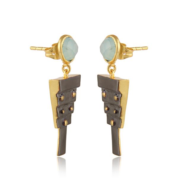 Caravanas de latón, bañadas en rodio y oro amarillo con acqua calcedonia, cierre a presión. Largo aprox.: 33 mm. Ancho aprox.: 13,7 mm. Hecho a mano. Latón: aleación de cobre y zinc.